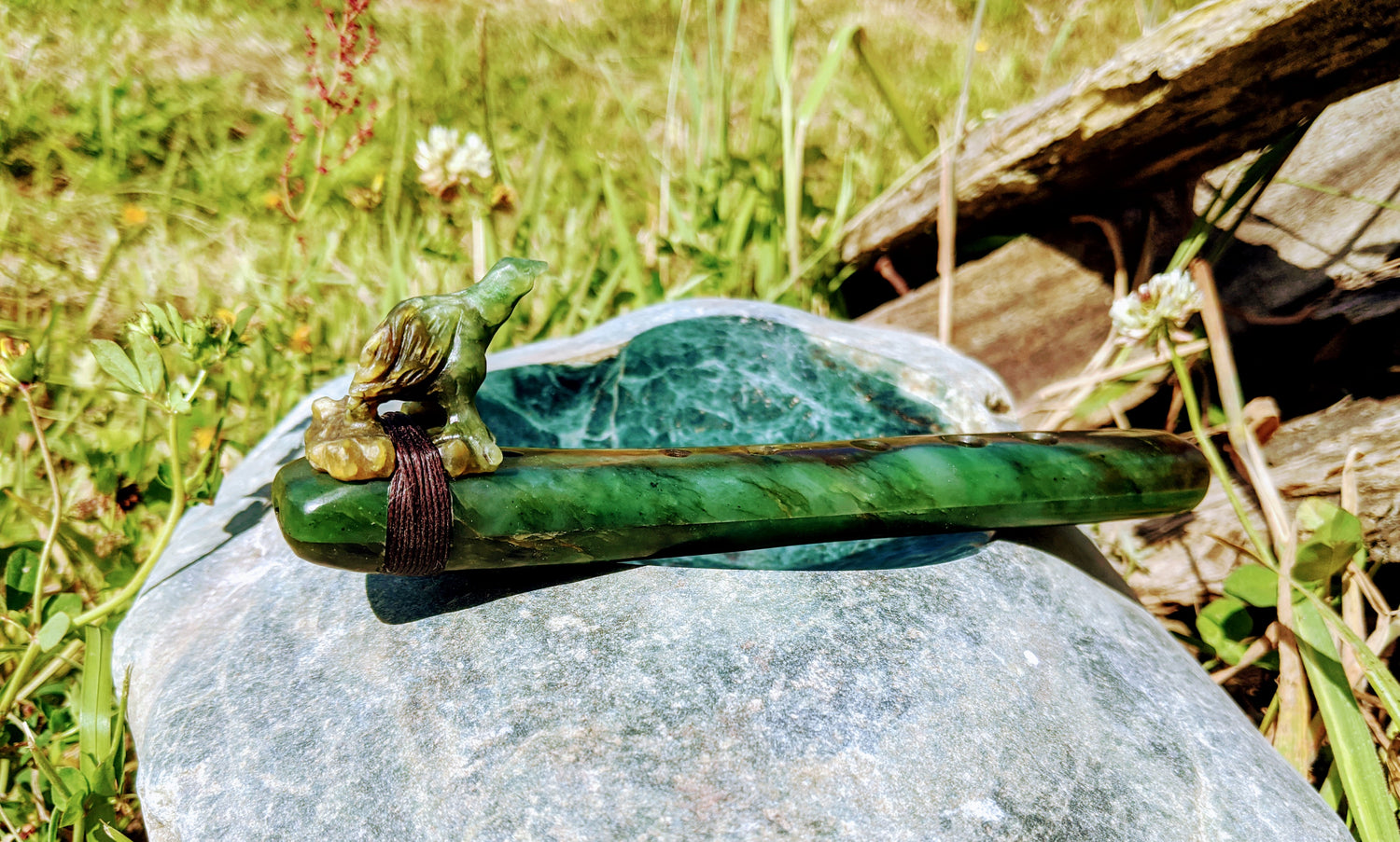 40 000 years old wood from new-Zealand preserved in swamps. Ancient Kauri wood sings with amazing resonance qualities. Combined with the healing properties and beauty of Pounamu Gem stone (Nephrite Jade)